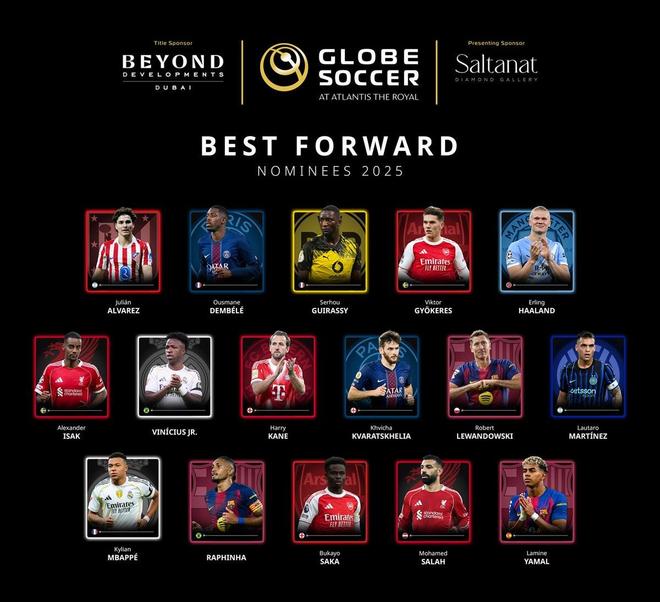 阿尔瓦雷斯(马竞)、登贝莱(巴黎)、吉拉西(多特)、哲凯赖什(阿森纳)、哈兰德(曼城)、伊萨克(利物浦)、维尼修斯(皇马)、凯恩(拜仁)、克瓦拉茨赫利亚(巴黎)、莱万多夫斯基(巴萨)、劳塔罗-马丁内斯(国米)、姆巴佩(皇马)、拉菲尼亚(巴萨)、萨卡(阿森纳)、萨拉赫(利物浦)、亚马尔(巴萨)